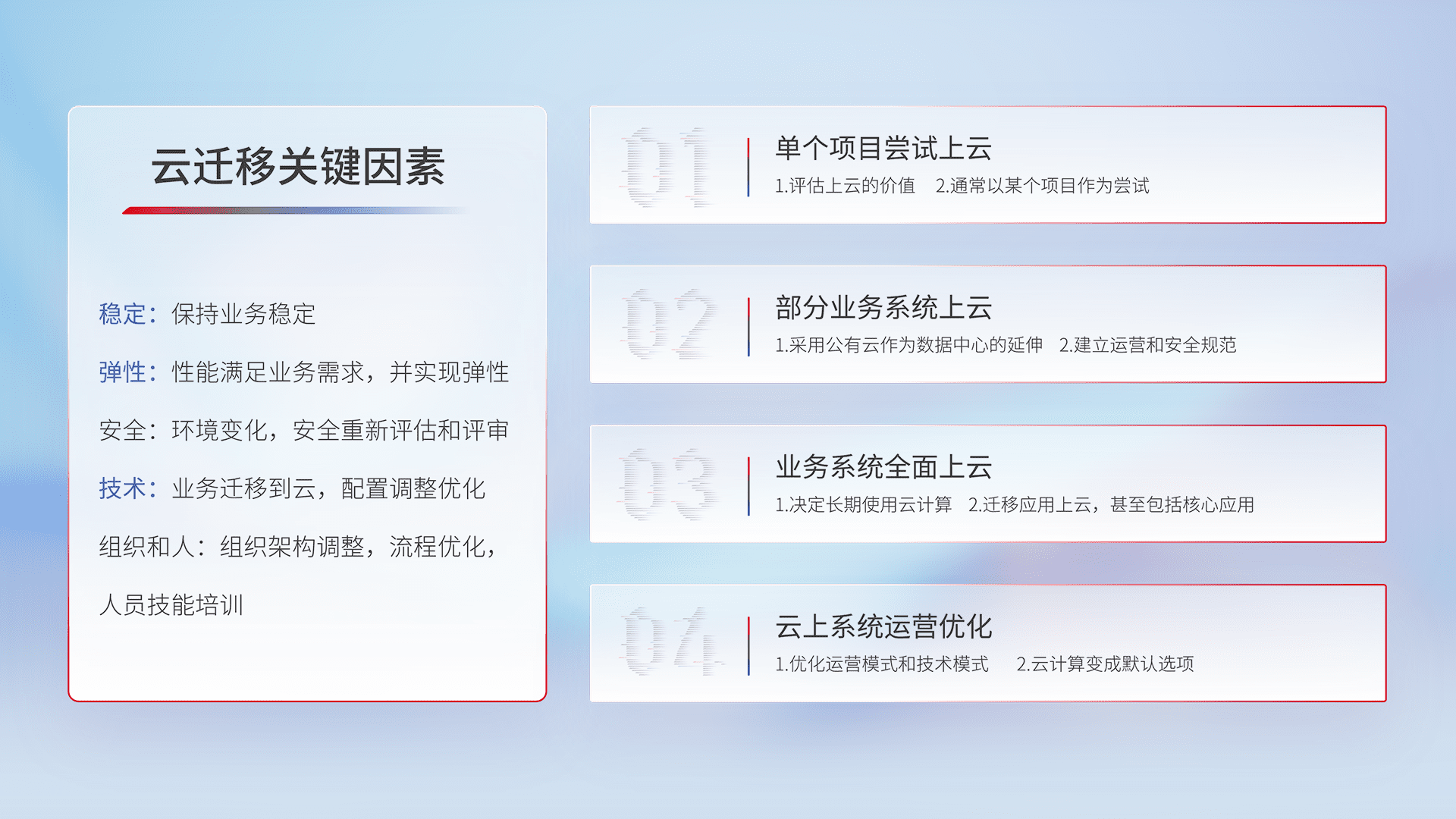 结合实际业务,,,,从规划设计、、、、云平台选型、、云原生改造、、、数据迁移、、、、集成交付,,,,迁移全过程为客户识别最佳上云路径,,,,做好风险识别管理,,设计网络架构、、、身份权限、、安全审计合规、、操作审计、、、、日志审计、、、监控告警策略、、、多站点容灾设计等,,,对云上基础设施进行整体规划,,提升IT治理水平,,以满足弹性、、、、高可用、、、高性能的需求。。